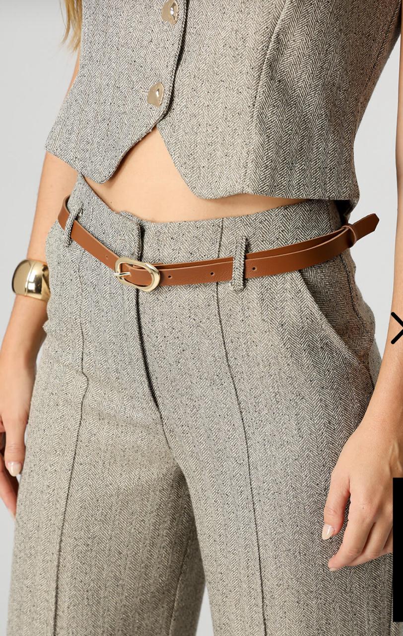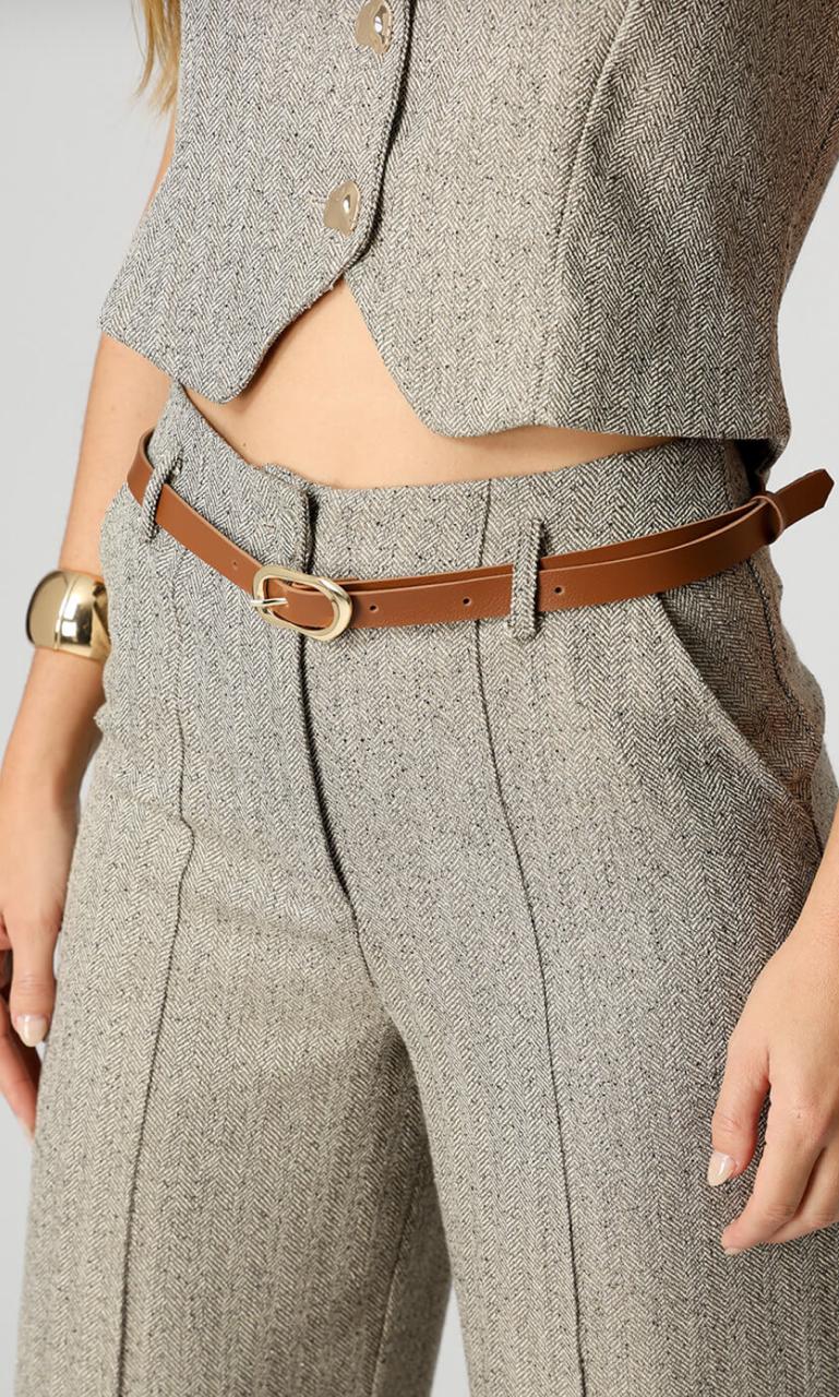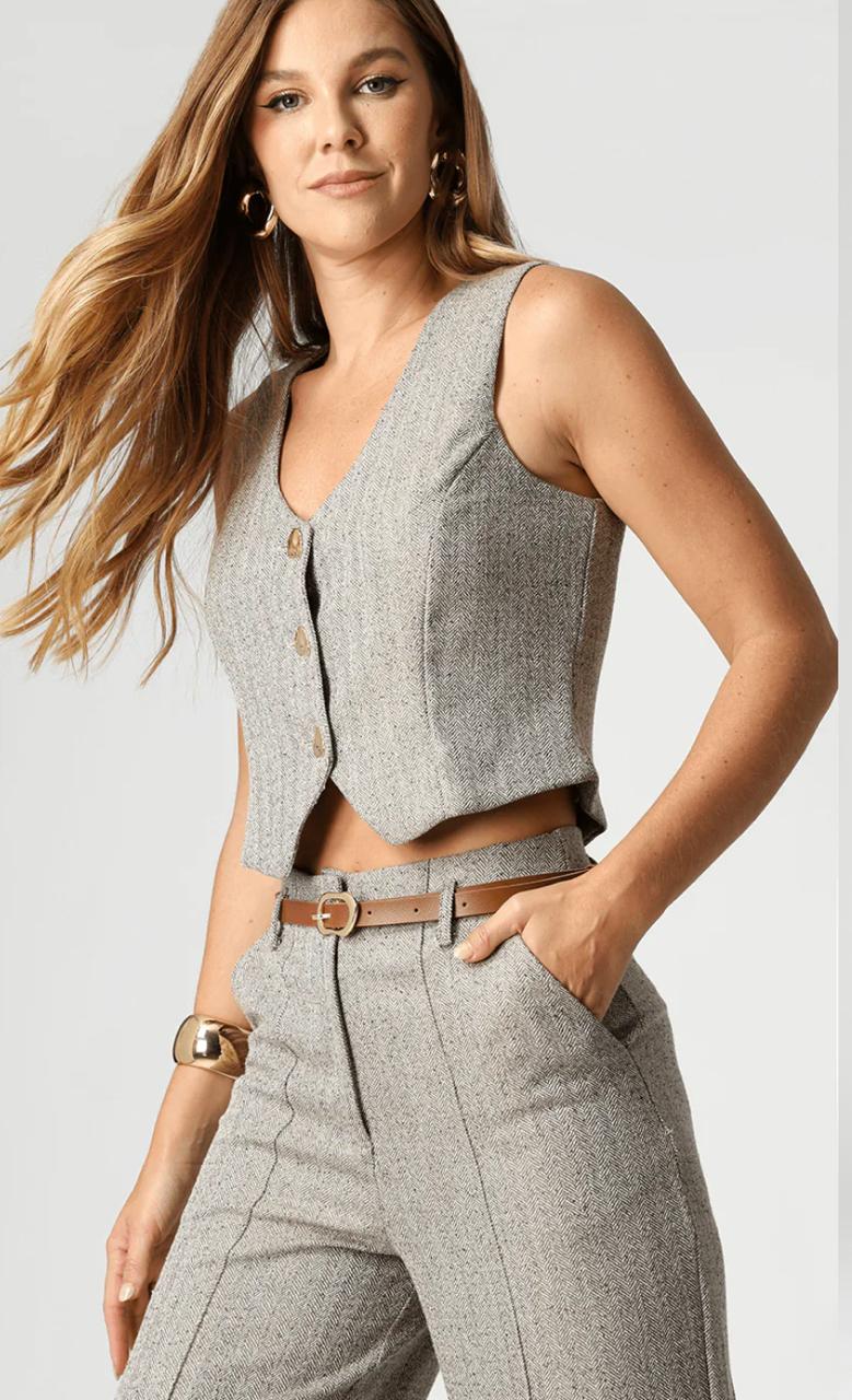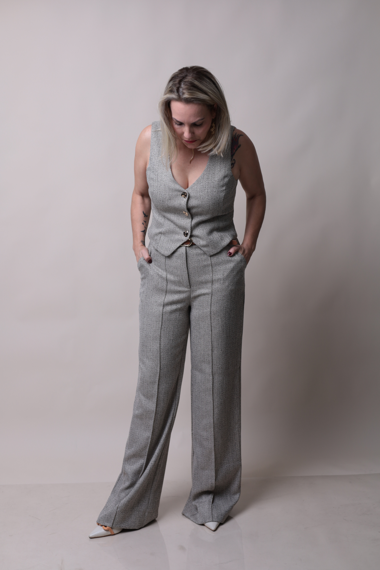 Conjunto moderno e elegante composto por colete estruturado e calça de alfaiataria. O colete tem decote em V, fechamento por botões frontais e recortes que valorizam a silhueta, trazendo um toque sofisticado e atemporal.