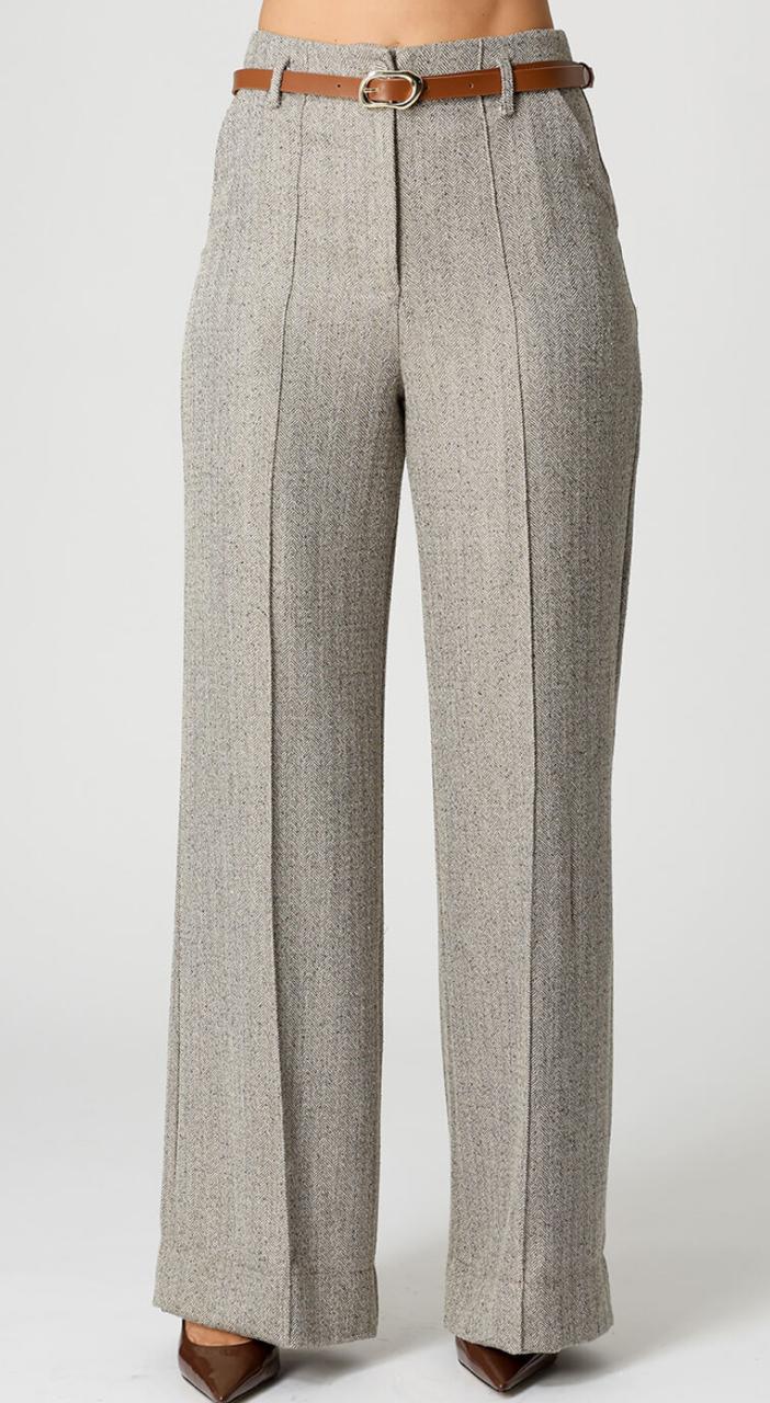 A calça possui cintura alta, pregas frontais e modelagem reta, garantindo conforto e caimento perfeito.