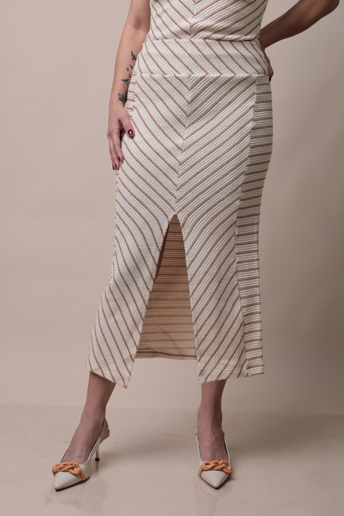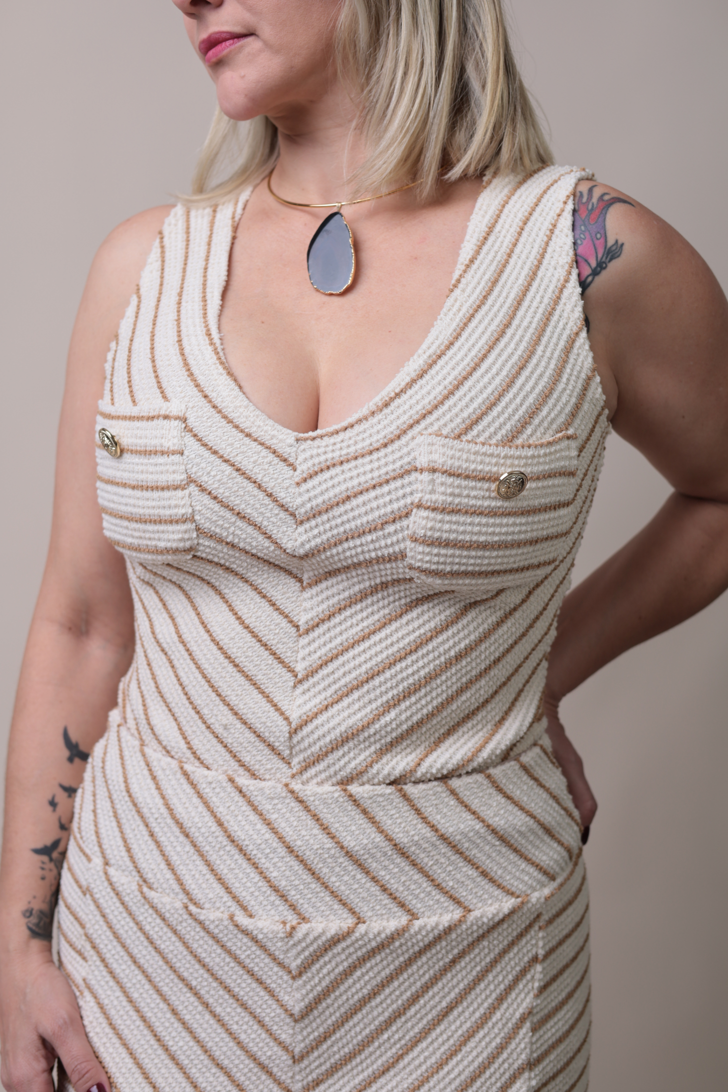 Conjunto feminino elegante em tricô canelado bege com listras douradas. A blusa sem mangas possui decote em V, detalhe de bolsos frontais com botões dourados, trazendo charme sofisticado. A saia midi ajustada ao corpo conta com fenda frontal, garantindo sensualidade e liberdade nos movimentos. Um look versátil e moderno, perfeito para ocasiões especiais ou eventos que pedem sofisticação.
