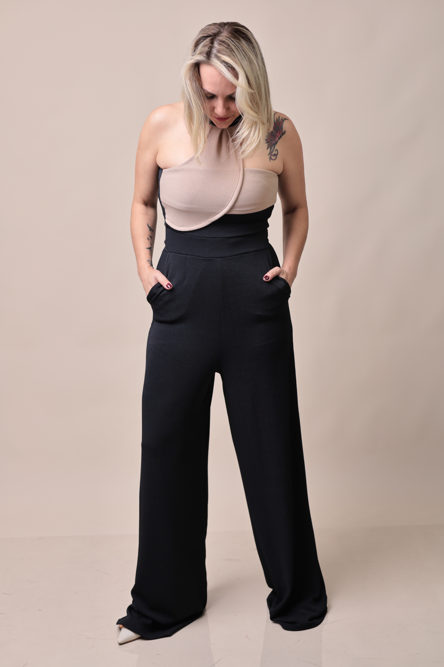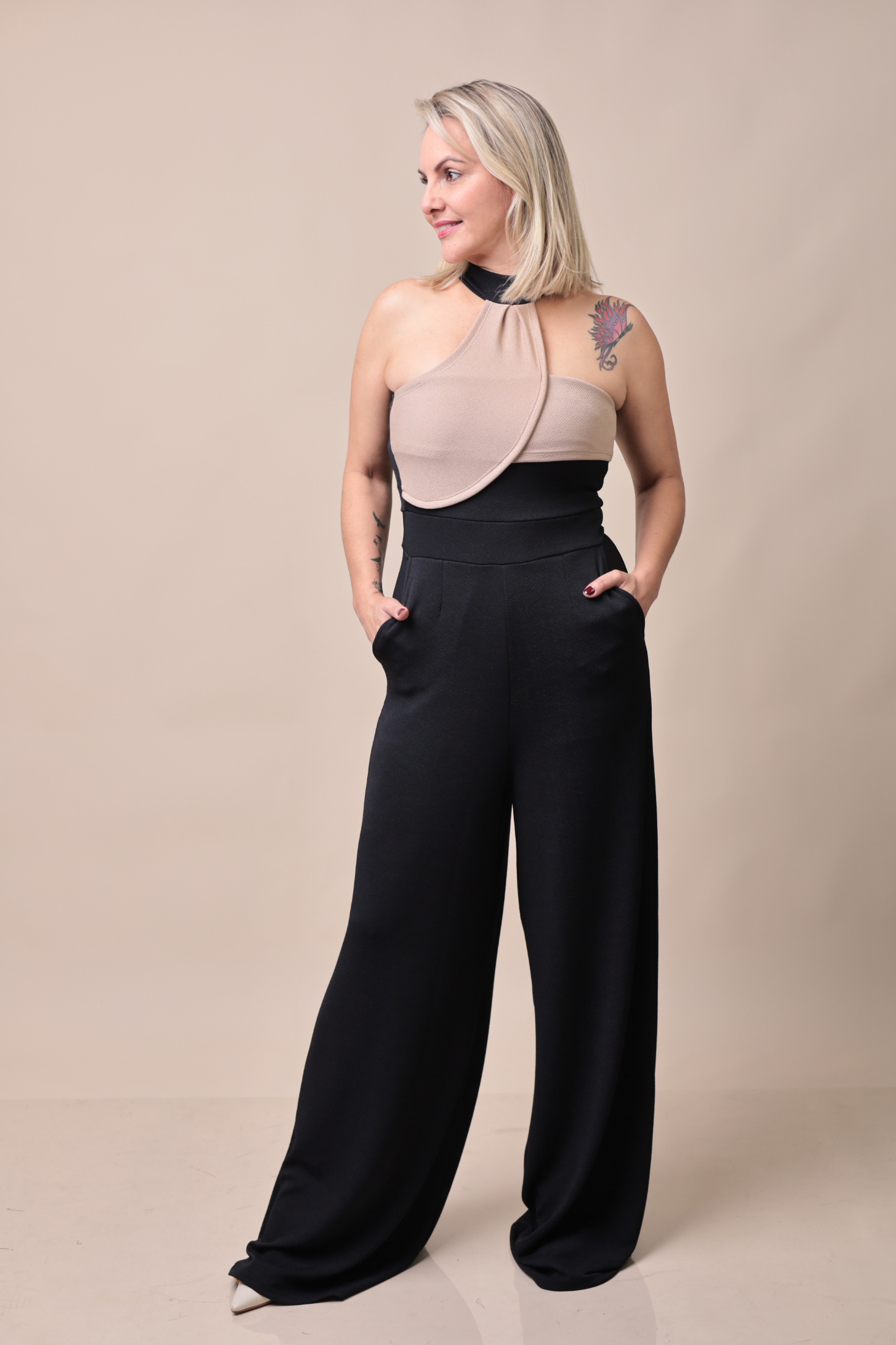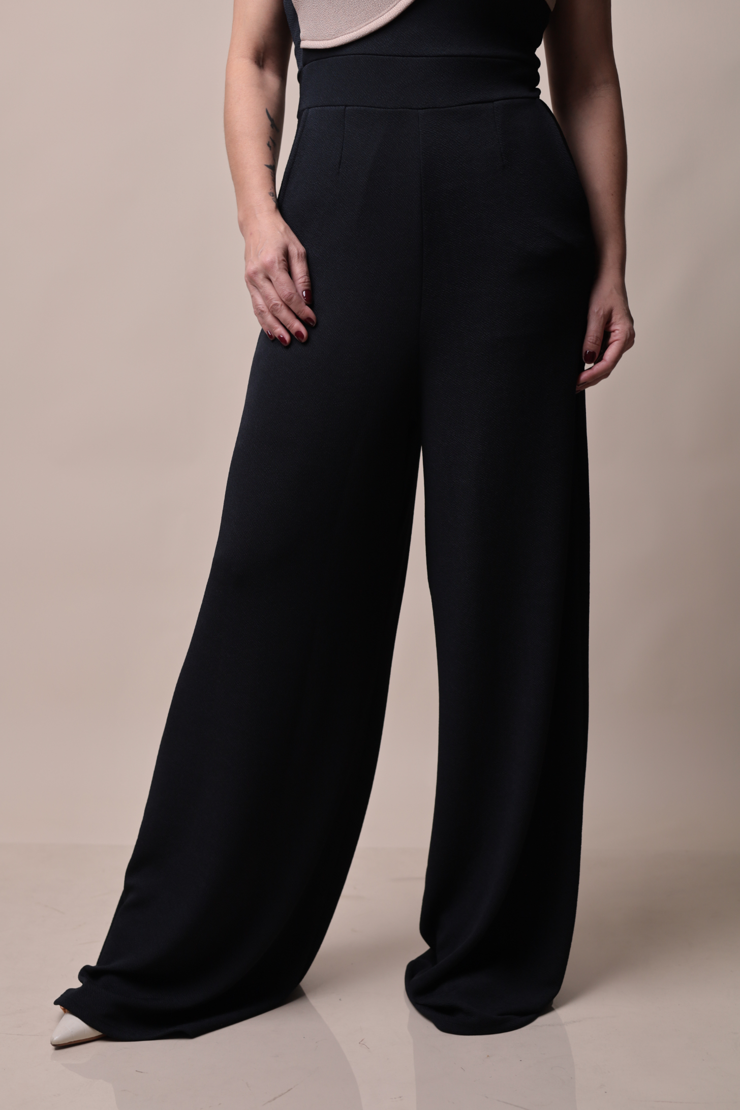 Modelagem: Pantalona com caimento fluido e cintura alta que alonga a silhueta.