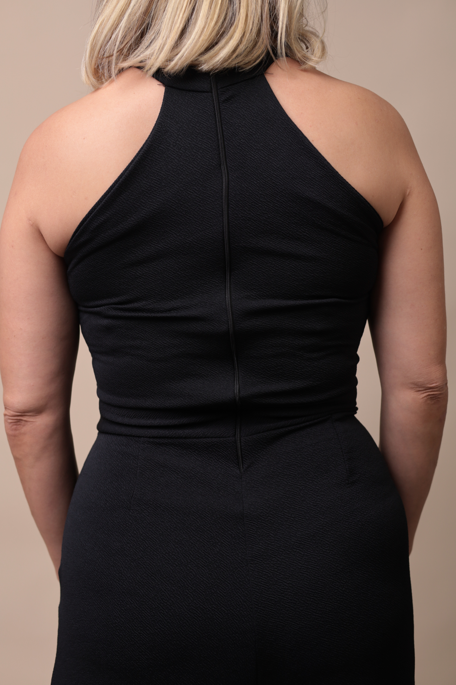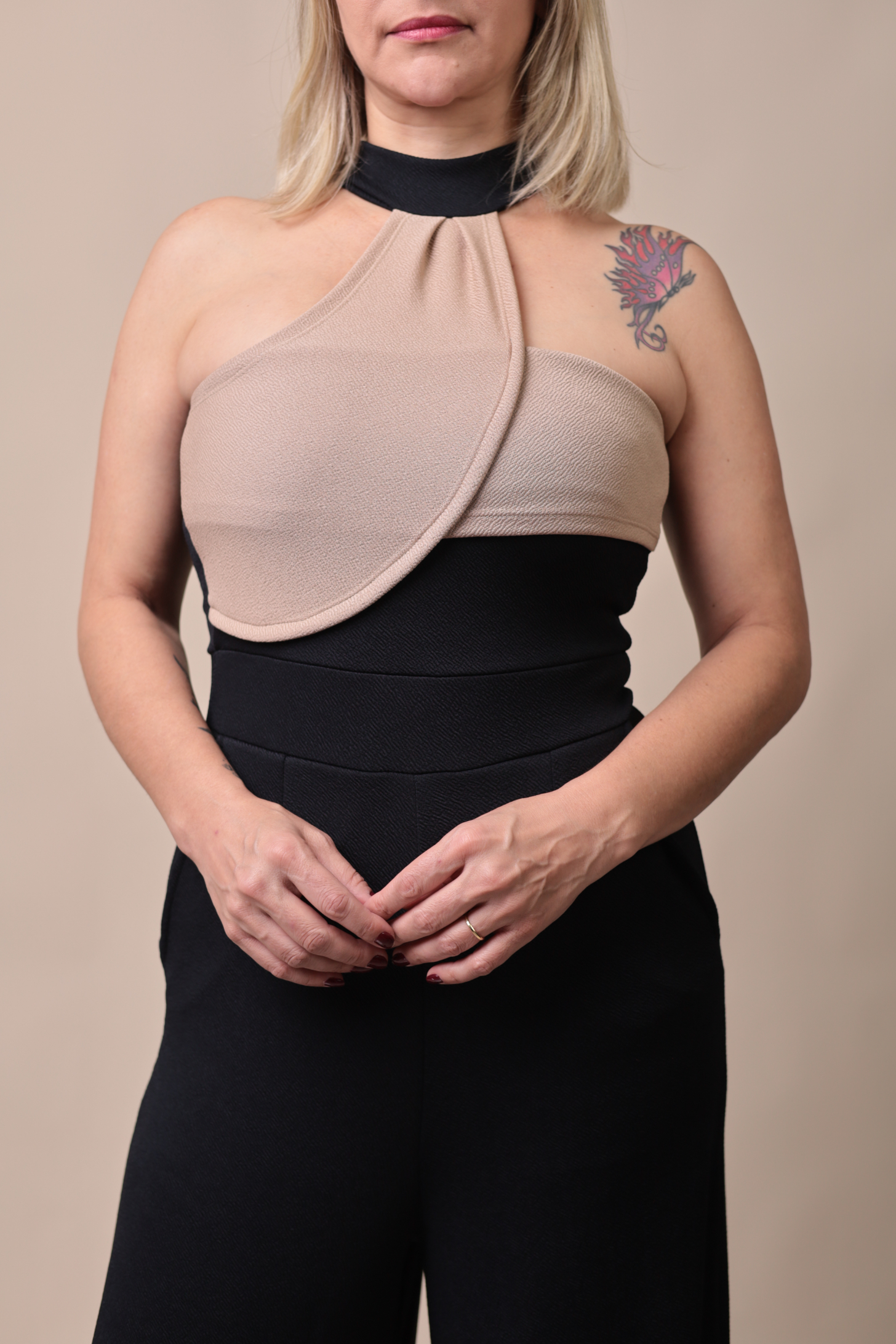 Parte superior: Decote assimétrico com detalhe em sobreposição, combinando charme e modernidade.