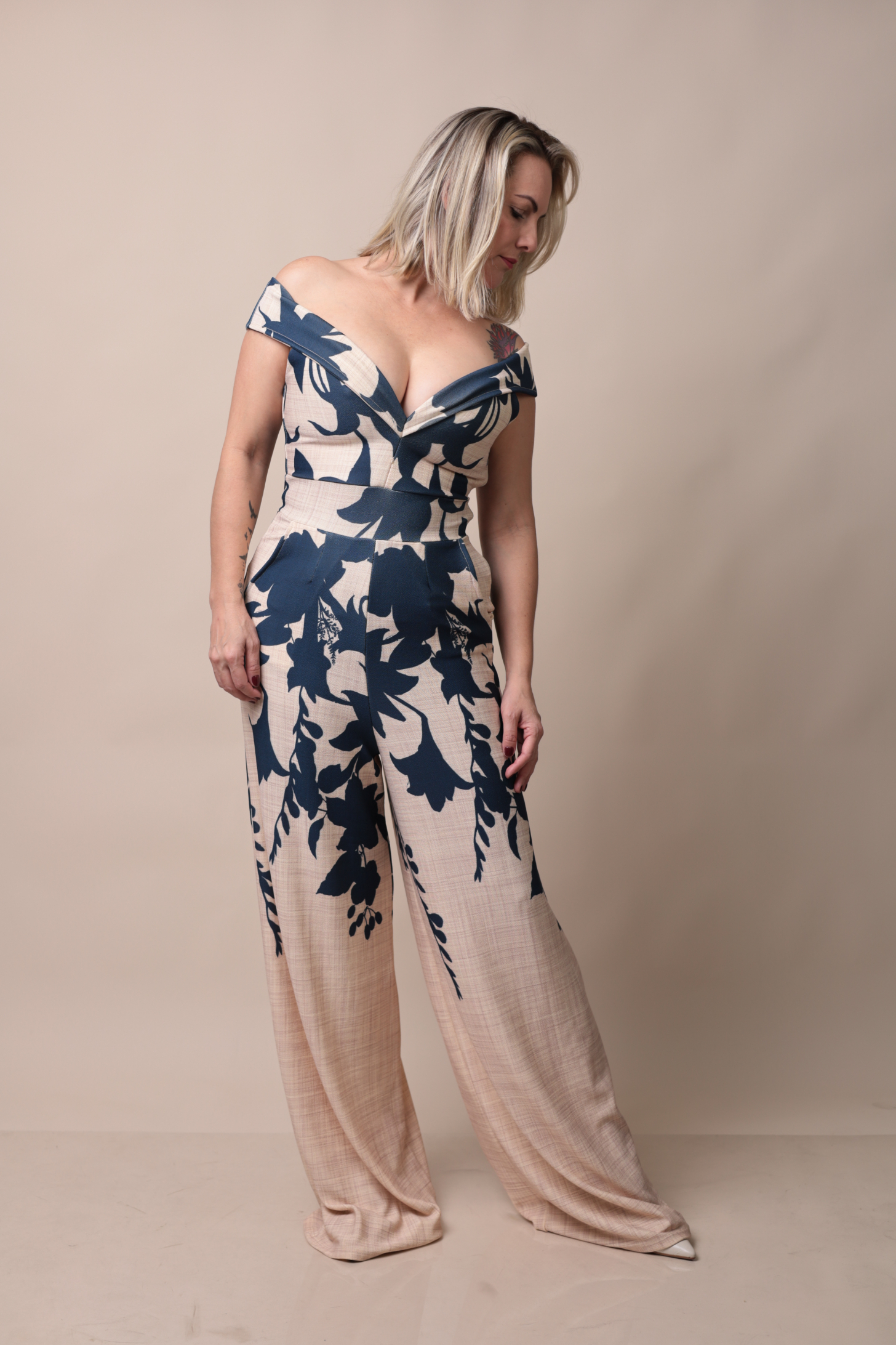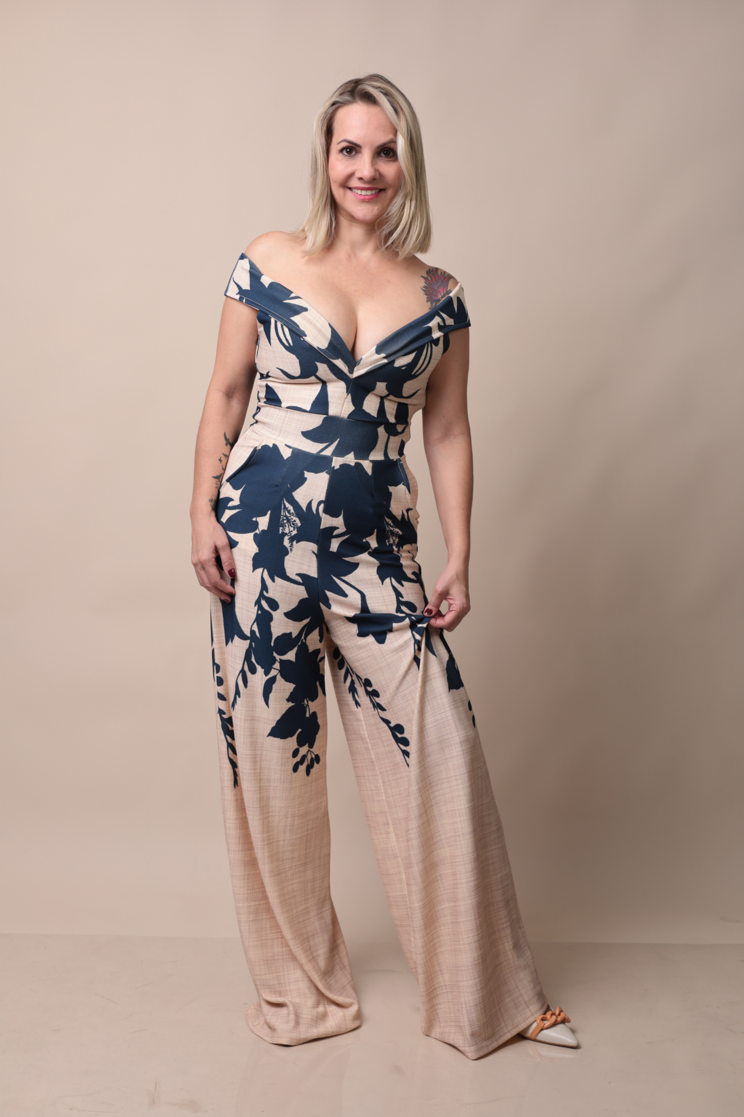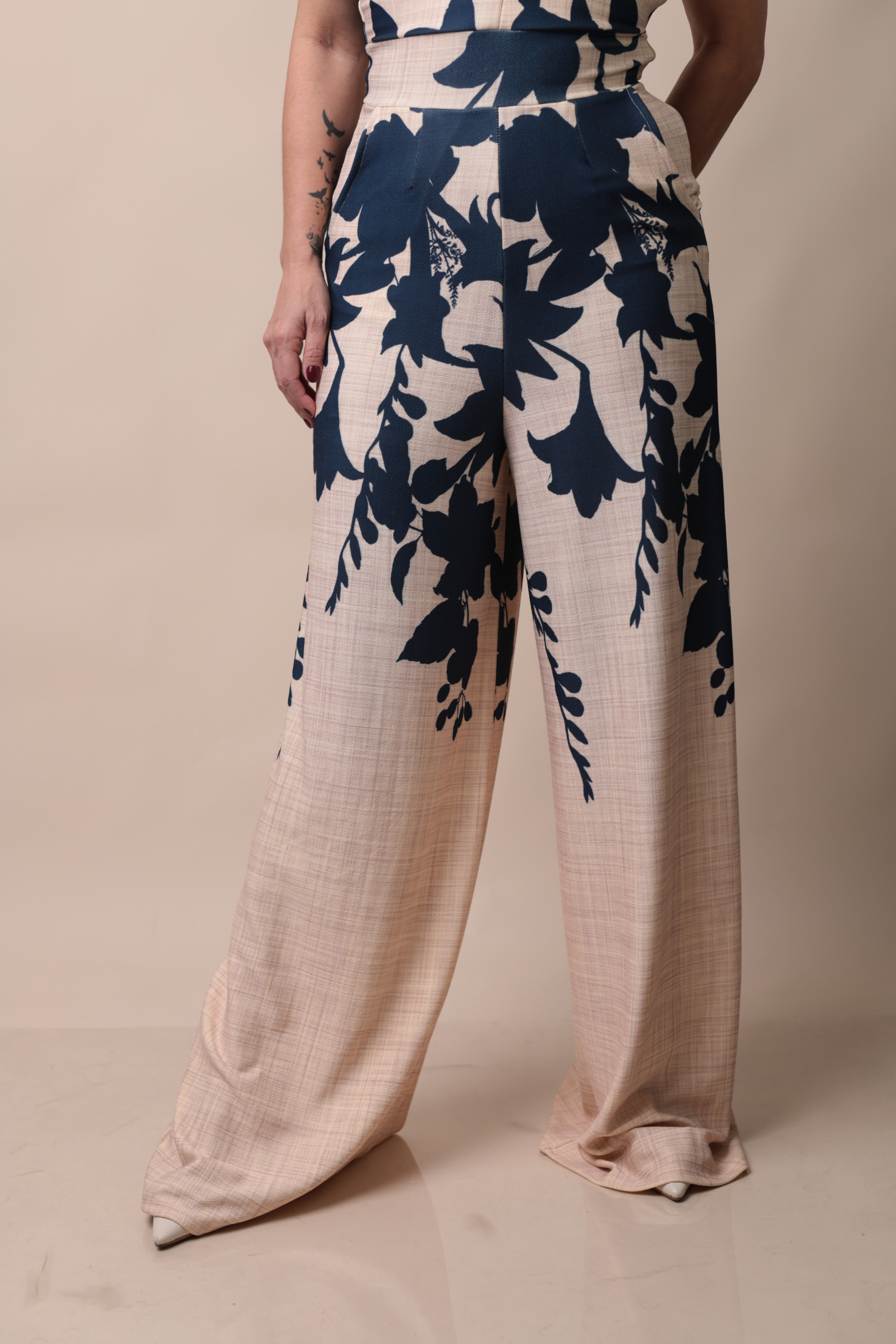 Possui calça pantalona e estampa floral em tons de azul marinho e bege, trazendo um visual moderno e sofisticado.