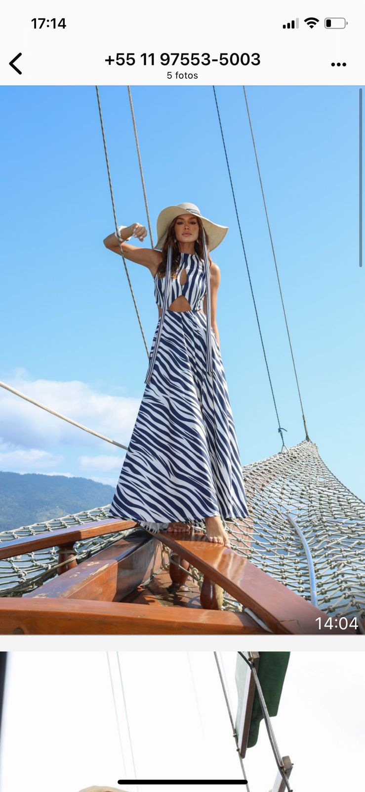 O design sem mangas deixa o visual mais fresco, ideal para dias quentes ou ocasiões à beira-mar. A cintura é bem marcada, destacando o corpo, enquanto a saia ampla equilibra o conjunto, trazendo sofisticação.