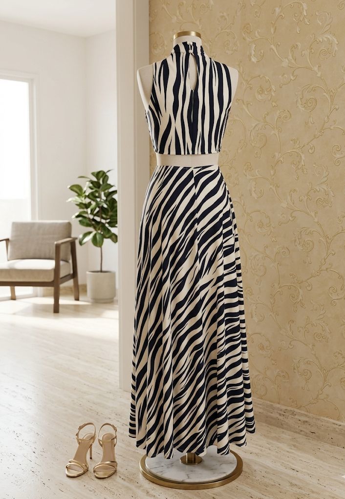 Esse vestido é elegante e moderno, com um toque sofisticado e marcante. Ele apresenta uma estampa em padrão zebra em preto e branco, que traz personalidade e estilo ao look.